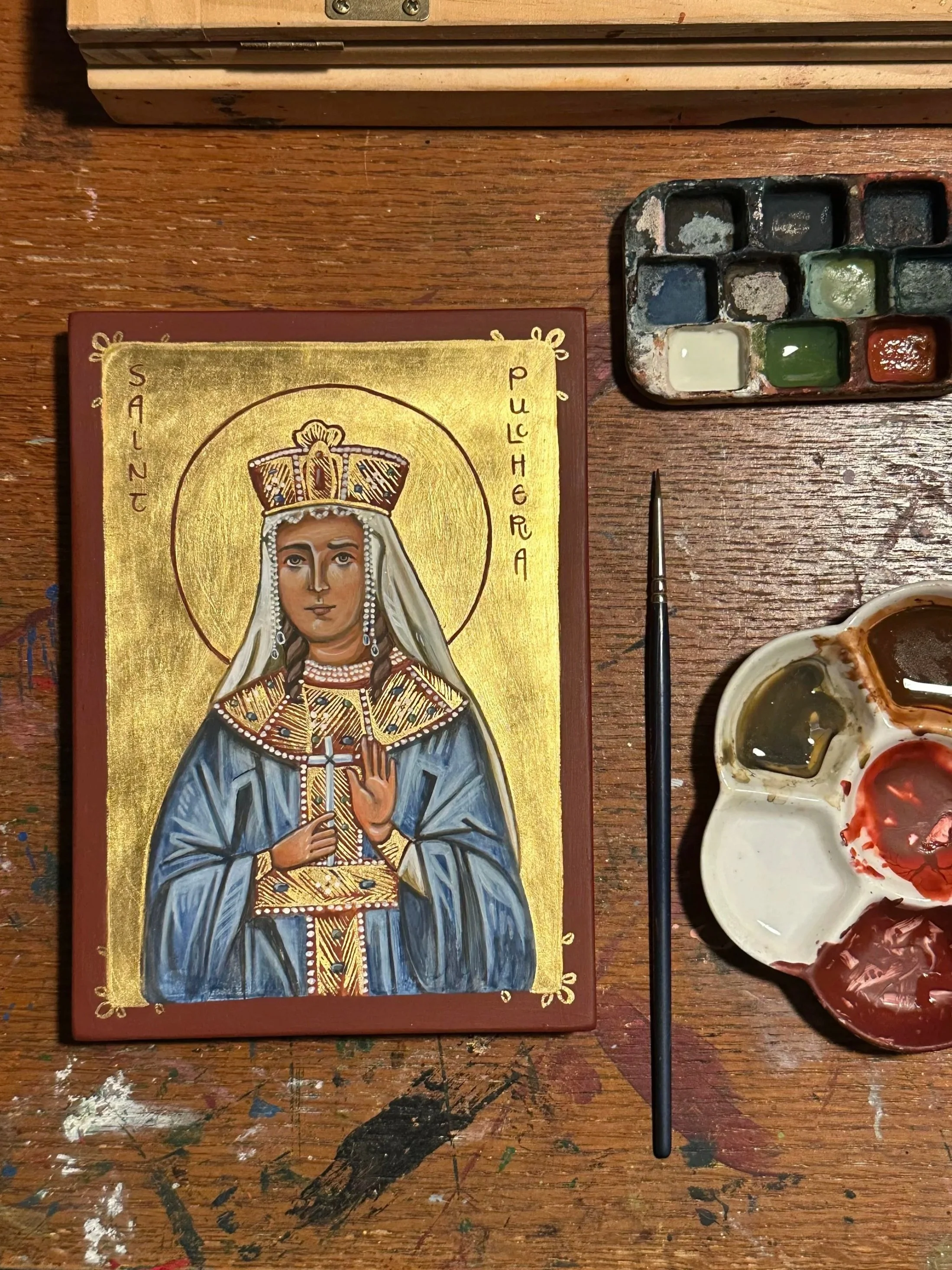 I now get to call the painting of holy images my work, and I spend my days studying and creating from the home I share with my husband Zach and our baby on the way (December 2025). With every icon I paint, I seek to maintain a posture of obedience to the tradition which has preserved these treasures of the Church for centuries, and so I am always referencing the masters, both past and present, to inform my painting. Intermingled with this is a spirit of dependence upon the Lord’s active inspiration and a love for the heritage of co-creation which the faithful still enjoy today.